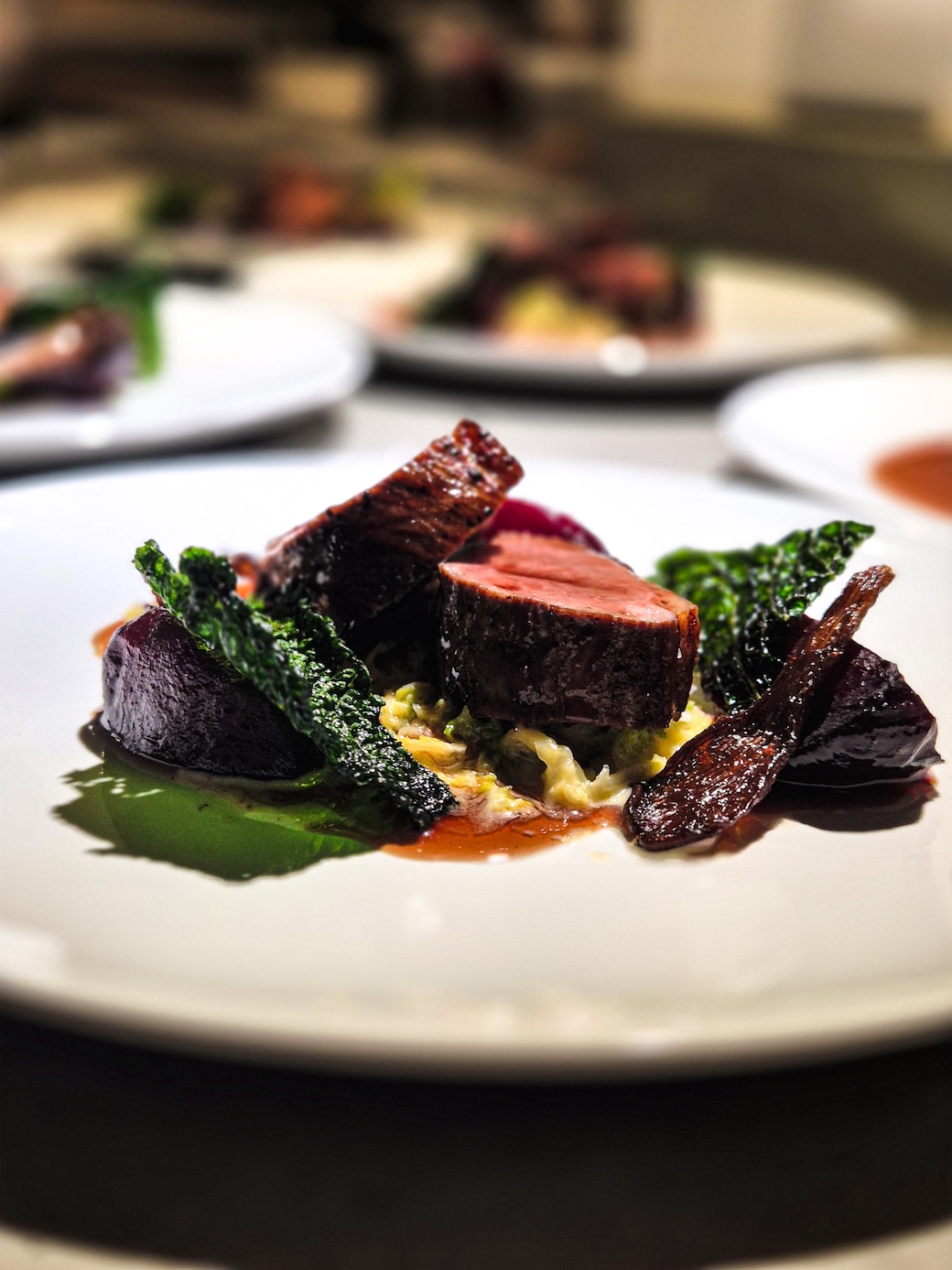 Hängmörad svensk ryggbiff serveras med mandelpotatispuré, rostad morot, saltbakad rotselleri, tryffelsmör och rödvinssås smaksatt med sherry