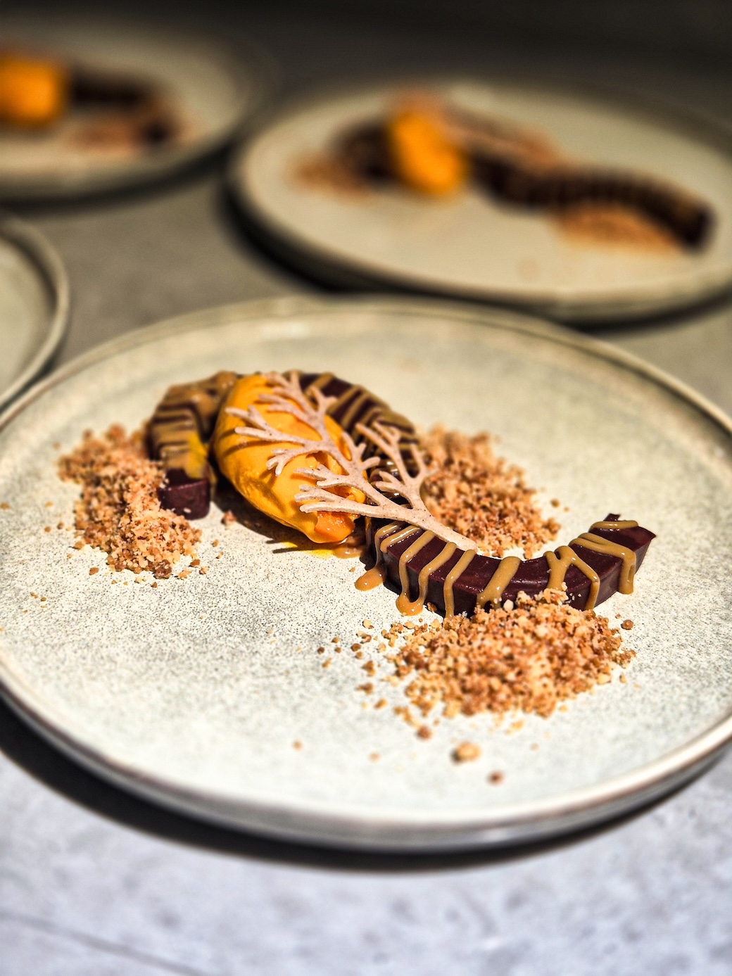 Chokladterrine av ekologisk Valrhonachoklad, salt karamell, havtorn samt crunch av Åhushonung